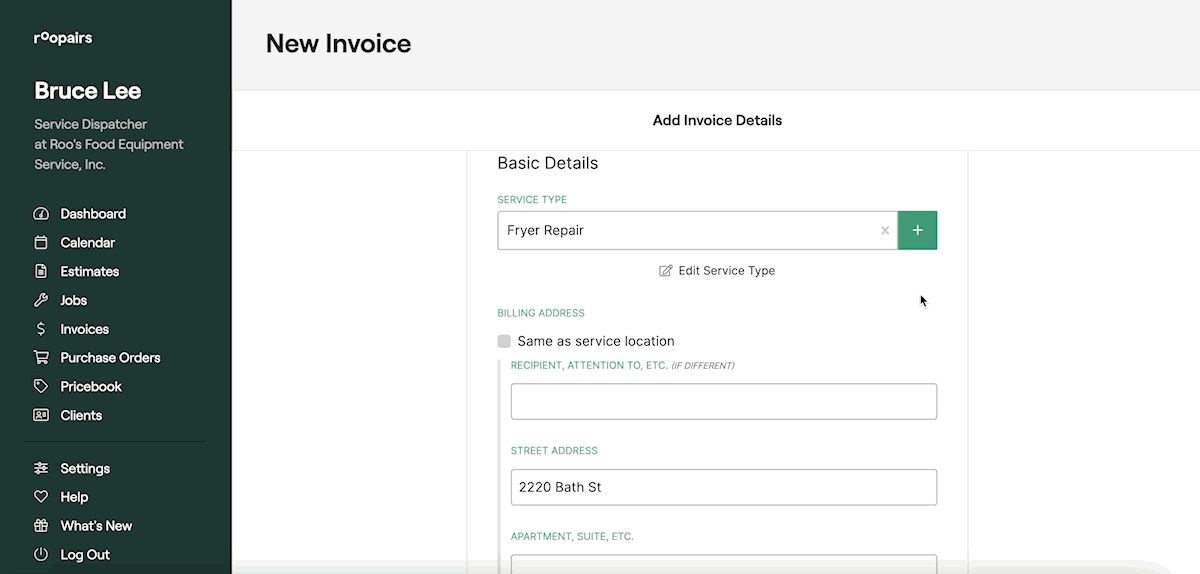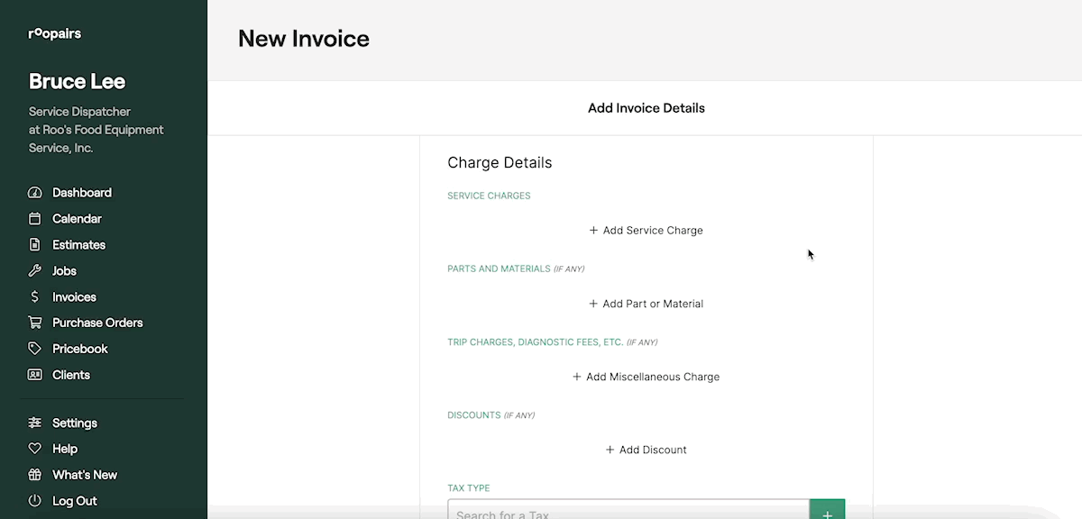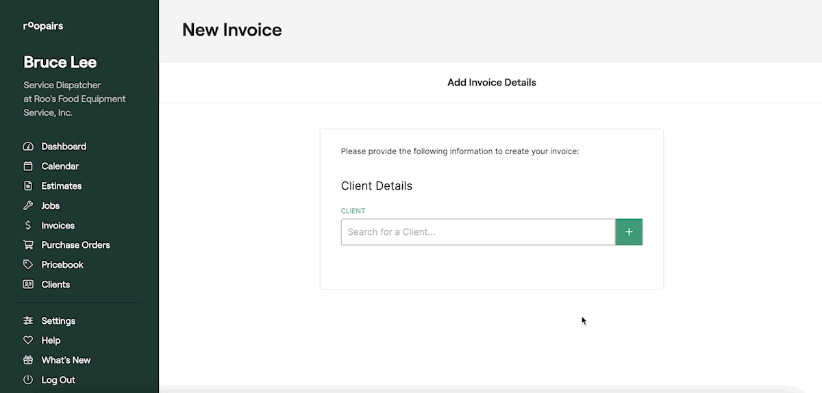 Roopairs allows you to create New Invoices for current or new Clients. Once you have entered in the details of your Invoice (Service Type and Service Charges/Parts) you are then able to use Roopairs to electronically send the Invoice to your Clients via email or text. Follow these steps to create your first Invoice.
