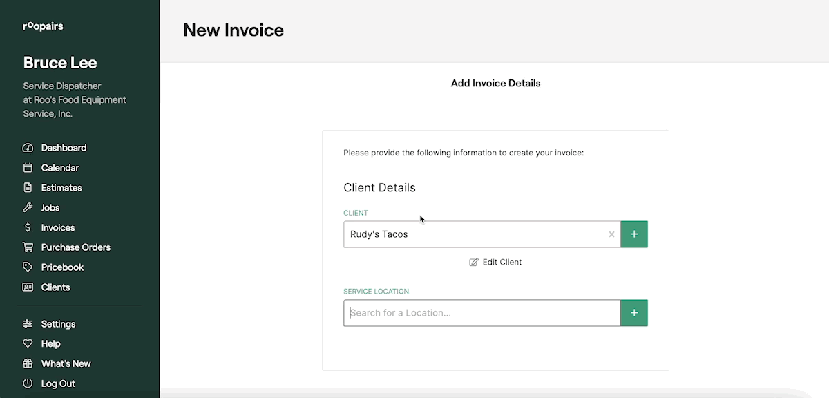 - If this Invoice is for a new Service Location that is not already in your system you can click the green