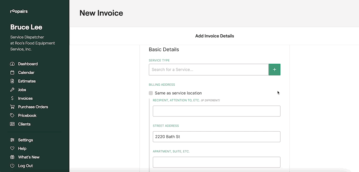 You can select the Service Location this Invoice is for from the dropdown by either clicking into the dropdown and choosing from the list or by typing in the name/address of the Service Location the Invoice is for.